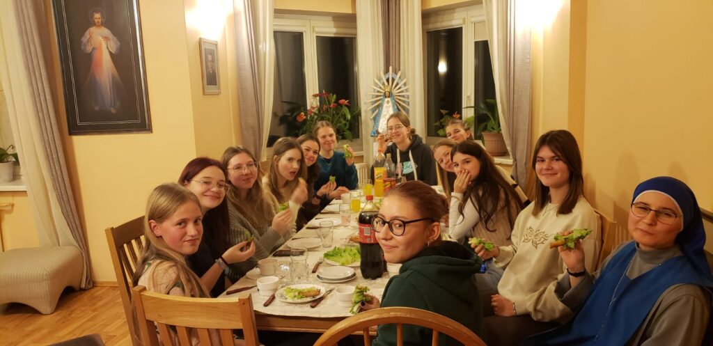 Nos reunimos en nuestra parroquia de Pumpėnai y viajamos al monasterio de nuestras hermanas contemplativas (a 25km de la parroquia). Para todas las jóvenes fue el primer encuentro con un monasterio de vida contemplativa. Las hermanas contaron sobre su vocación y vida monástica, subrayando que es una vocación, una vida de mayor entrega y sacrificio por amor a Dios. Las jóvenes se sorprendían y preguntaban si las hermanas no se cansaban de los sacrificios que impone este estilo de vida… a lo que las hermanas respondieron que Dios, el Autor de la vocación, da la gracia de responder cada día y llevar todo sacrificio por su amor. Fue un gran testimonio de la vida consagrada y de un amor radical. Las jóvenes quedaron muy impactadas.