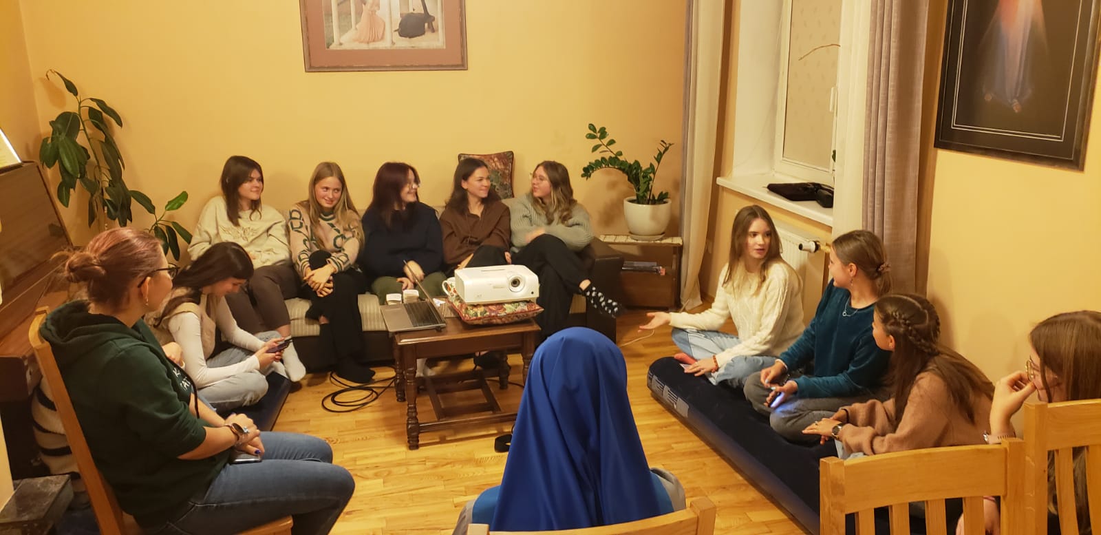 Después de la visita al monasterio, pasamos una tarde en nuestro convento en clima muy familiar y de alegría. A pesar de que la gran mayoría de las chicas no son muy practicantes, se captaba el deseo y sed de algo más profundo, de Dios y de su cercanía, tal vez todavía no del todo consciente. Las jóvenes con mucho interés escuchaban sobre nuestras misiones en distintas partes del mundo, hacían preguntas sobre temas de la fe y moral y prefirieron simplemente escuchar y conversar con las hermanas antes que los juegos y diversión que les habíamos preparado.