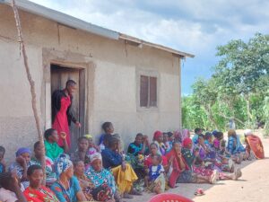 Al llegar, en la casa ya había un grupo grande de vecinos, y sin demorarnos, comenzamos los preparativos para la misa. Habían colocado dos “turubai” (o toldos de plástico) dispuestos para el altar y el féretro. Los hombres sentados todos juntos, debajo de un árbol de mangos. Las mujeres, por su parte, todas juntas, en otro lugar, bajo la sombra que proyectaba una de las casas. El clima se mostraba amenazante, pues se escuchaban muchos truenos, y el cielo estaba oscurecido por nubes muy densas de lluvias. Comenzamos el ritual de exequias, y les pedimos que se acercaran un poco al altar. Lo que sucede en lugares como éste, es que la mayoría son paganos y nos saben participar de la celebración. En muchas ocasiones se ponen a hablar, y a veces hasta a reírse, y molesta un poco la ceremonia. Les pedimos a los católicos que se pusieran adelante, cerca del altar, para que ellos respondan y lleven el ritmo de la celebración, cuando hay que pararse, sentarse, o arrodillarse. Comenzamos la santa misa, y comenzó a llover muy despacito… gracias a Dios, no impedía que siguiéramos, y yo rezaba para que no pasara de allí, pues no teníamos a dónde mudarnos para continuar. Los hombres en un momento se retiraron unos metros para atrás, para estar sentados debajo del árbol. Las mujeres se tapaban con sus telas (kitenge), y los dos tolditos funcionaban a la perfección para nosotros, catequistas y sacerdote. Gracias a Dios siguió todo en orden, pero no podíamos demorarnos mucho.