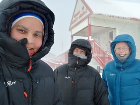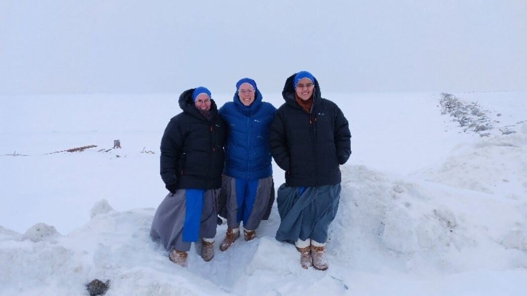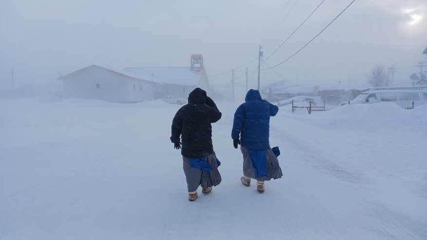 Hoy finalmente hemos entendido el porqué de las grandes camperas con piel de animales que rodea la cara: el furor del viento del mar de Bering junto a los -10oC quema la frente y las mejillas, haciendo insoportable el llevar las manos descubiertas durante más de dos minutos. Y lo digo por experiencia, ya que intentamos rezar el Rosario afuera y lo logramos, pero no sin mucha aventura. No podíamos ver mucho. Todo era blanco y en mis adentros repetía aquello del P. Segundo: «Yo le decía al Señor: Que se salve un pecador por cada copo o molécula de nieve que veo hoy con los ojos».