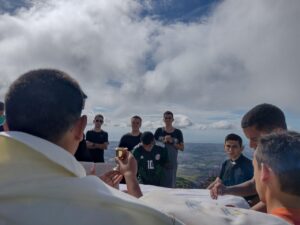 Viajamos, então, mais de 500 km até Vitória, no Espírito Santo – estado no qual São José de Anchieta (padroeiro de nosso Seminário Maior), após anos de missões no Brasil, entregou o espírito a Deus. Conhecemos o Palácio Anchieta, antigo colégio dos Jesuitas e onde o santo foi sepultado e guarda algumas relíquias. Bem como todo o complexo construído pelos jesuítas e indígenas no século XVI. Logo, iniciamos as atividades de caráter mais esportivo (acampamento/escalada), com a subida do Morro do Moreno, um pequeno monte com 184 metros de altitude a beira mar, proporcionando uma visão panorâmica de tirar o fôlego de toda a grande vitória. No dia seguinte, subimos o monte Mestre Álvaro, na subida exigente nos motivava as palavras do Apóstolo “esquecendo do que fica para trás e avançando para o que está adiante, olhando para a meta”[2], pois logo participaríamos da Santa Missa no topo.