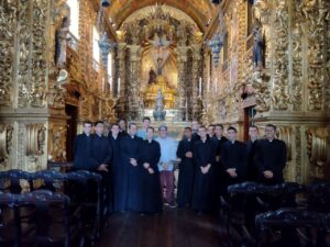 En la cima del monte Corcovado, visitamos el Santuario del Cristo Redentor. Allí tuvimos la oportunidad de participar en la Santa Misa, presidida por el Maestro de Novicios (Padre Tito Paredes), comenzando el día con el acto central y fundamental – que marca todo el ritmo de nuestro tiempo de convivencia – de nuestras vidas. Visitamos también en Río de Janeiro, en los días siguientes, el Monasterio de São Benito, donde fuimos muy bien recibidos por los monjes y pudimos conocer con más detalle todo el complejo del antiguo monasterio fundado en 1590 y sus actividades actuales, así como crecer en el conocimiento de la vida monástica de otras órdenes de nuestra Iglesia; fuimos al Teatro Municipal y también a la Catedral Metropolitana de São Sebastião; Tuvimos la oportunidad de conocer las bellas iglesias de Candelária, la Catedral Vieja y la Iglesia de São Francisco de Paula, siendo, en estas dos últimas, agraciados con la presencia de los párrocos, que nos explicaron las condiciones actuales de sus parroquias y un poco de su historia, ampliando nuestro conocimiento de las diferentes ramas del arte religioso [1].