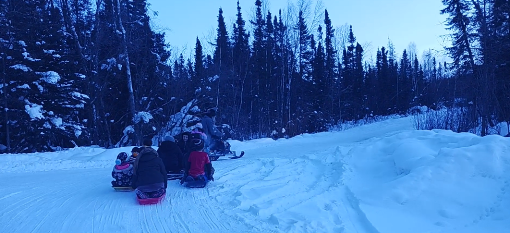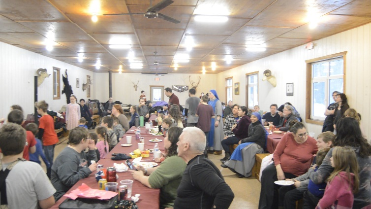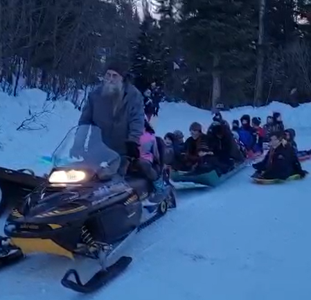 Nosotras, las hermanas, preparamos toda la comida antes y con la ayuda de algunos voluntarios que llegaron más temprano organizamos todo cuanto pudimos. Una de las primeras preocupaciones era hacer un camino en algún monte para que los niños pudieran deslizarse por la nieve. Entre el diácono Chuck y Dominic, uno de los jóvenes, lo lograron; pero fue muy difícil, varias veces se quedaron atrapados en la nieve con sus motos. Pero al final todo salió muy bien. Con el camino hecho, los niños, contentos, podían transitar con sus trineos.