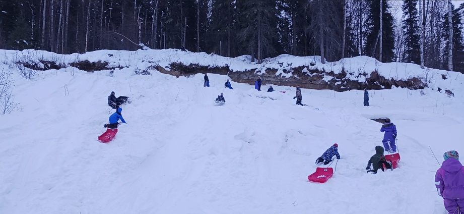 Las familias empezaron a llegar alrededor de las 10hrs. Inmediatamente los niños se pusieron sus abrigos y salieron corriendo al encuentro de la nieve con los brazos abiertos. Y así pasamos toda la mañana: la mayoría de los papás en el comedor charlando y los niños y jóvenes aventureros bajando y subiendo los montes nevados. Para los niños nacidos en Alaska nunca hace demasiado frío para estar fuera, y el correr de las horas no es un problema para ellos.