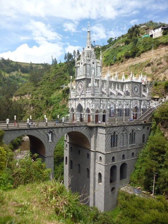 En compañía del padre de este joven sacerdote (P. Iván) fuimos a visitar dos santuarios marianos. El primero de ellos, construido en el interior de una gruta natural formada por la erosión del río. No surgió de alguna aparición sino de la sola fe de los hombres que imploraban la paz para el mundo (1945). El otro es también fruto de la fe cristiana palpitante en nuestros hermanos colombiano, pero que sí tuvo origen con el hallazgo de la Virgen. En Lajas, ciudad limítrofe al sur con Ecuador, una pequeña sube hasta unas rocas donde encuentra a la Madre del cielo. Allí comienza el inicio de la advocación a N S de las Lajas.