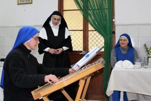 Al ir terminando el almuerzo, comenzó el fogón, que se desarrolló en un clima de alegre familiaridad. Un canto con la cítara, otro en francés, folklore argentino y español, un baile ucraniano, y hasta una representación muy graciosa de algunas anécdotas “agustinas”. Además, nos visitó Santa Teresa (la hna. María Arca de la Alianza), quien estuvo conversando unos momentos con la “decana” de las Agustinas (93 años) y luego nos recitó una de sus poesías…