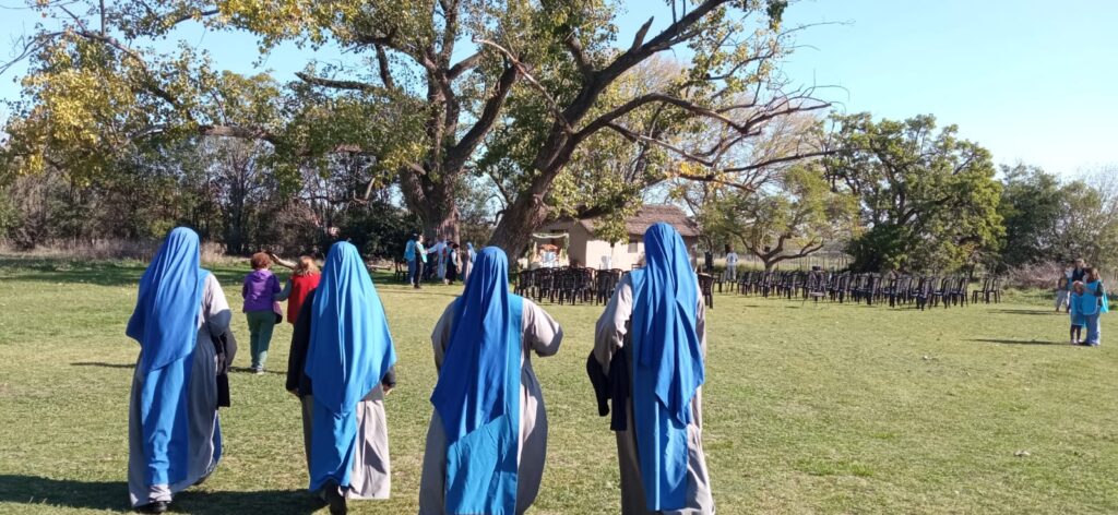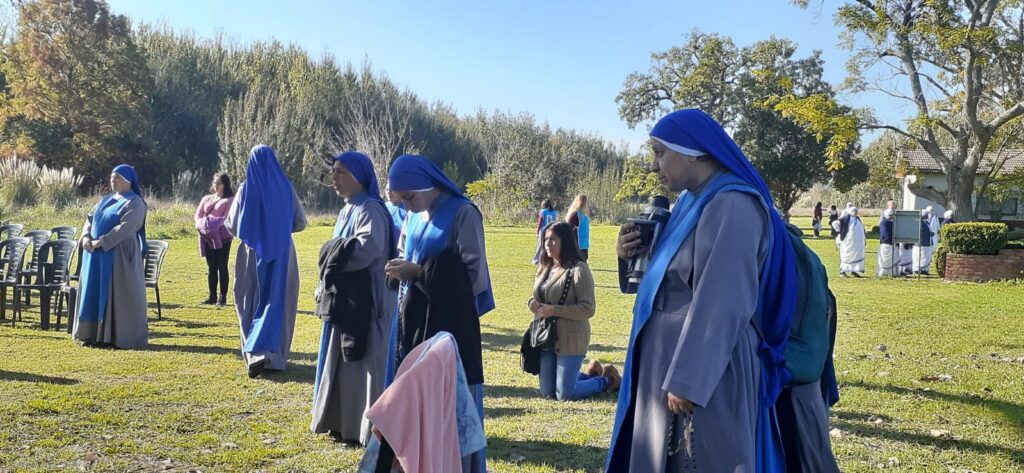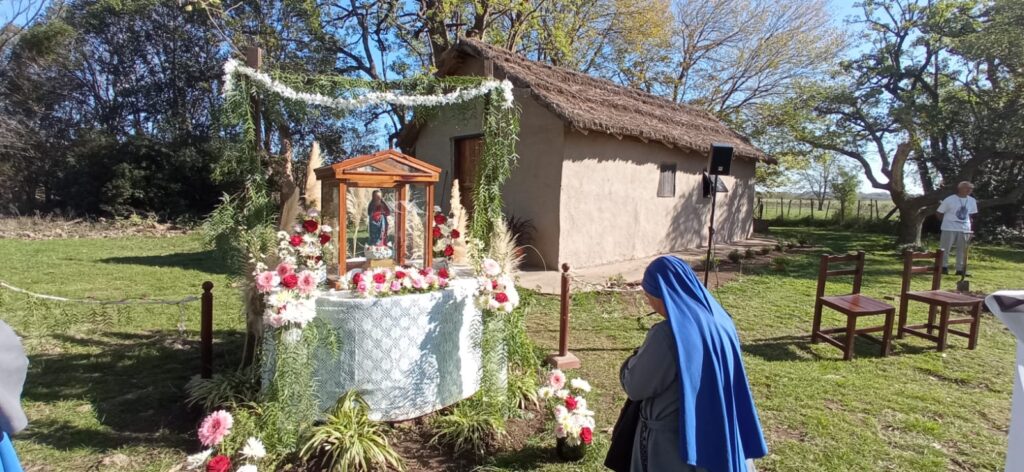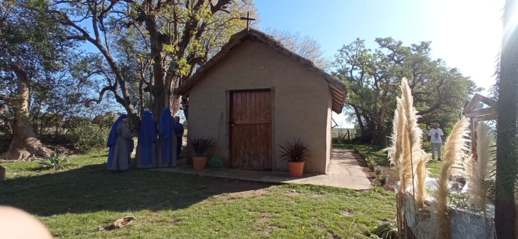 Después de cantar el Himno a la Virgen de Luján y rezar por las intenciones del Santo Padre para ganar las indulgencias concedidas en este día, nos dirigimos a Zelaya, a la zona donde ocurrió el milagro de la carreta. Allí se encuentra la primera réplica de la Virgen de Luján, y el lugar donde estuvo la primera capillita de la Virgen. Es una zona de campo, un lugar de silencio y oración, y nos acompañó un hermoso día de sol.