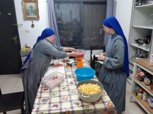 Hemos recibido varias visitas de nuestros religiosos y religiosas, como el P. Carlos Ferrero y el P. Gabriel Romanelli, como ya les hemos contado, pero también de más de un grupo de nuestras hermanas misioneras también en Tierra Santa; dos de las cuales hasta nos dieron una mano para preparar las mermeladas que nos ayudan a sustentarnos. Respecto a esto, como les contamos anteriormente, también ha sido una gracia enorme la realización de la cosecha y aceite de este año para contribuir también a nuestro sostenimiento, y esta semana el comienzo de la poda de los olivos que no pudimos hacer el año pasado y que ciertamente es muy necesaria.