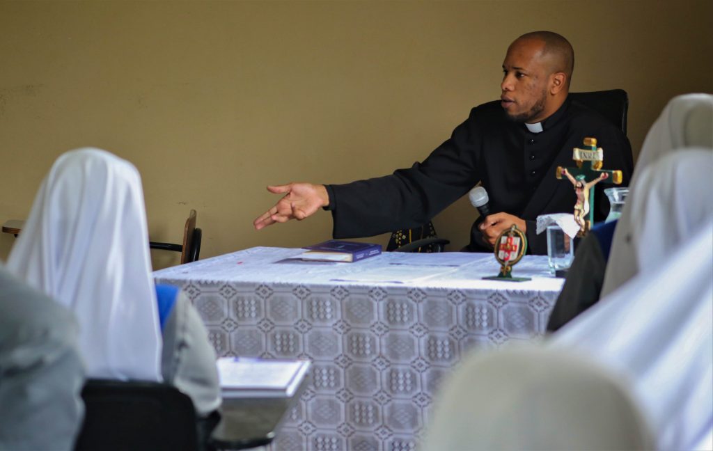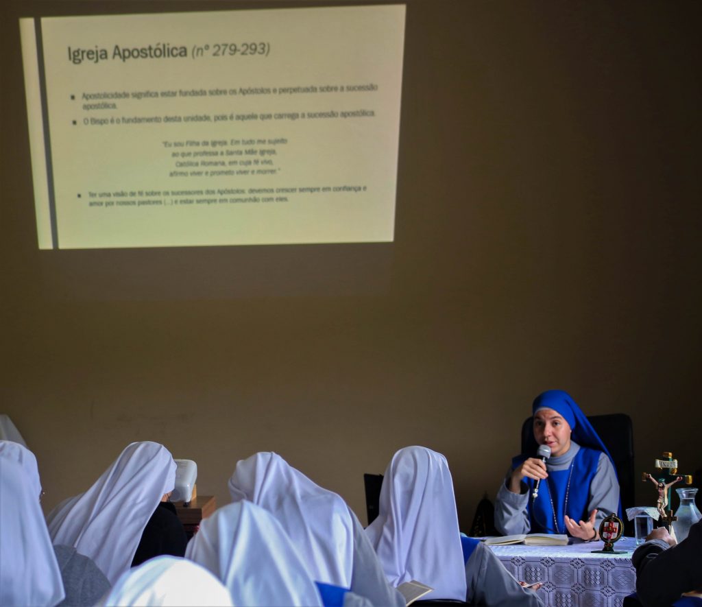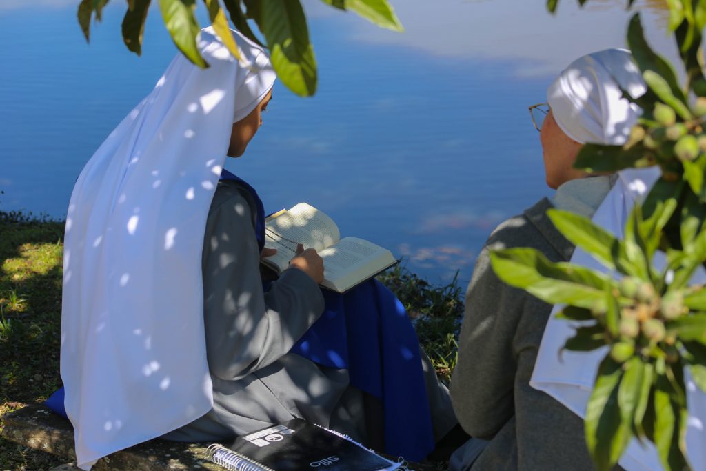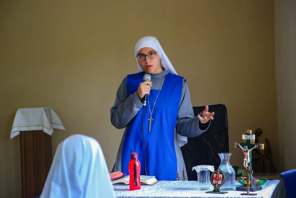 El Padre Jesús Eduardo nos acompañó en esta semana tan especial y, por estar desde los inicios en la Congregación, tenía muchas historias –y mucha paciencia– para contarlas. Recibimos como expositores a nuestro asesor espiritual, el P. Gilberto Galdino, y a varias Madres y hermanas. Algo que nos enriqueció especialmente fue el hecho que cada novicia presentara un tema para las demás. Unas hablaban de la vida fraterna, tan importante para nuestra perseverancia, otras de la maternidad espiritual que debemos tener, porque somos, ante todo, esposas de Cristo y madres de las almas, entre otros puntos de las Constituciones.