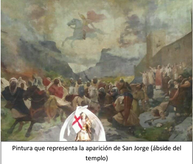 [1] “El haber sido soldado San Jorge dio ocasión a que la gente de guerra le invocase contra sus enemigos, y fomentóse esta devoción con varias apariciones que del santo se refieren en algunas batallas, dejándose ver armado peleando en favor de los fieles. En España especialmente, tenemos de esto ejemplos en que convienen nuestros historiadores. En la batalla que el rey Pedro I de Aragón dio en los campos de Alcaraz a los moros de Huesca por los años de 1095, apareció San Jorge a caballo, y peleó en defensa de los cristianos, hasta que por ellos se declaró la victoria. El rey, en memoria de este singular beneficio, mandó reedificar con magnificencia en aquel mismo sitio el templo de San Jorge antes citado, el cual se había conservado por los cristianos mozárabes que vivían en Huesca sujetos a los moros de aquella ciudad; y desde entonces quedó el glorioso San Jorge jurado y votado por patrón de los reyes aragoneses, y apellidado en sus guerras. No pasaron muchos días sin que con obras confirmase San Jorge el amor con que amparaba aquel reino; porque en el año 1096, en la batalla que el dicho rey Don Pedro y el Cid tuvieron en Valencia con el rey moro Buscar, se halló también San Jorge por los cristianos. Lo propio hizo por dos veces en tiempo del rey Don Jaime el Conquistador. Fue la una en la batalla que se dieron sus capitanes que estaban en frontera en el castillo de Puig de Enesa, y el moro Zaen, rey de Valencia. La otra fue en el sitio que Alarazarach, general de los moros, puso a Alcoy…” (Año Cristiano, de Croisset, SJ).