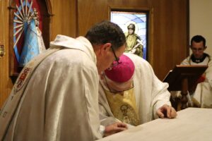 Ya desde el martes 25 se empezó a rezar el triduo en honor de San Luis María, compuesto con fragmentos de sus propios escritos; también se hizo referencia al santo y a sus enseñanzas en la homilías y en las buenas noches, todo esto con mucho provecho de los novicios. Pero el mayor regalo fue la posibilidad de justo en día tan especial, tener la presencia del Obispo y la consagración y dedicación de la Capilla Nueva y del Altar. Fue así que en apenas un día y medio, nos pusimos a preparar toda la ceremonia, buscando las reliquias que iban a ir debajo del altar, estudiando la ceremonia y consiguiendo los distintos elementos: brasero, gremial, óleos, etc.