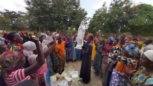 En primer lugar, se preparó un coro de 120 personas. La mayoría de ellos provenientes de diversas aldeas, y para unificar bien los cantos y las voces, se realizaron muchos ensayos, varios de ellos en diversos puntos de la parroquia, para que todos puedan participar. Algunos debían viajar casi 20 km para poder reunirse. El día anterior a la fiesta, sábado 12 de febrero, hicieron todo un día de ensayo. El coro ciertamente que ayuda en la liturgia de la misa, pero de manera especial en Tanzania, el coro cumple una función importante respecto al “clima o espíritu” de fiesta. Animan con sus cantos el fogón, pero también cantan durante la procesión, y casi podríamos decir que “en todo momento”. Por ejemplo, en el colectivo, en el viaje para llevar de regreso a los miembros del coro de Nyasa y Mwendakulima, fueron cantando durante dos horas completas.