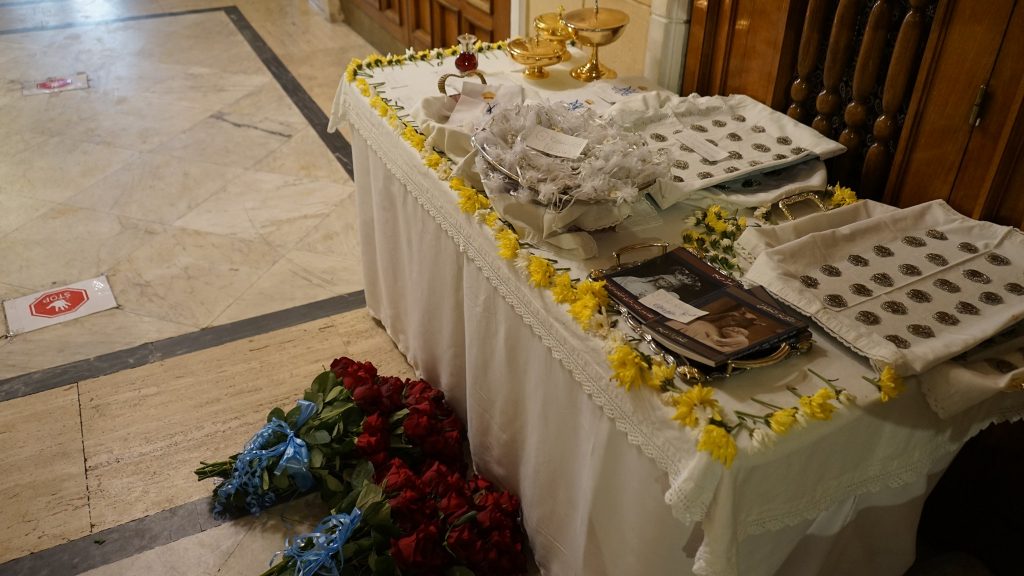En nuestra peregrinación de ayer por varias iglesias de Bagdad, fuimos primero a la parroquia de la Ascensión del Señor. En el presbiterio se encuentra esta imponente cruz con una doble inscripción: en árabe «La Cruz es la potencia de Dios», y en arameo «La Cruz vence».