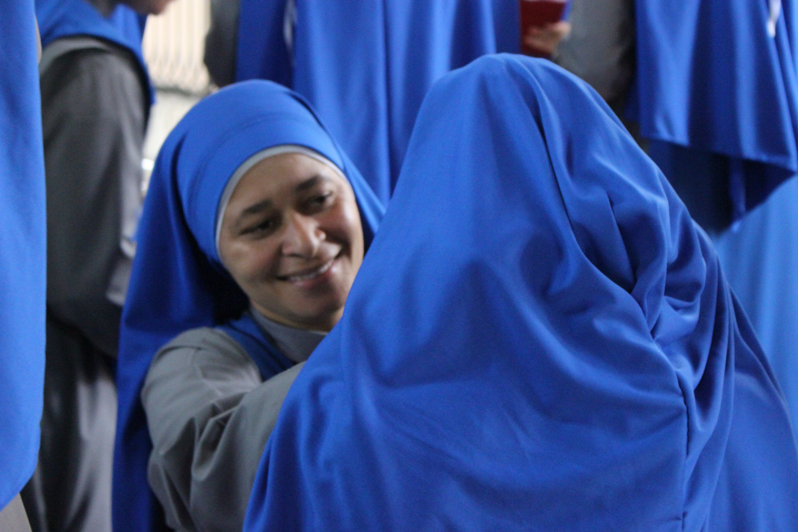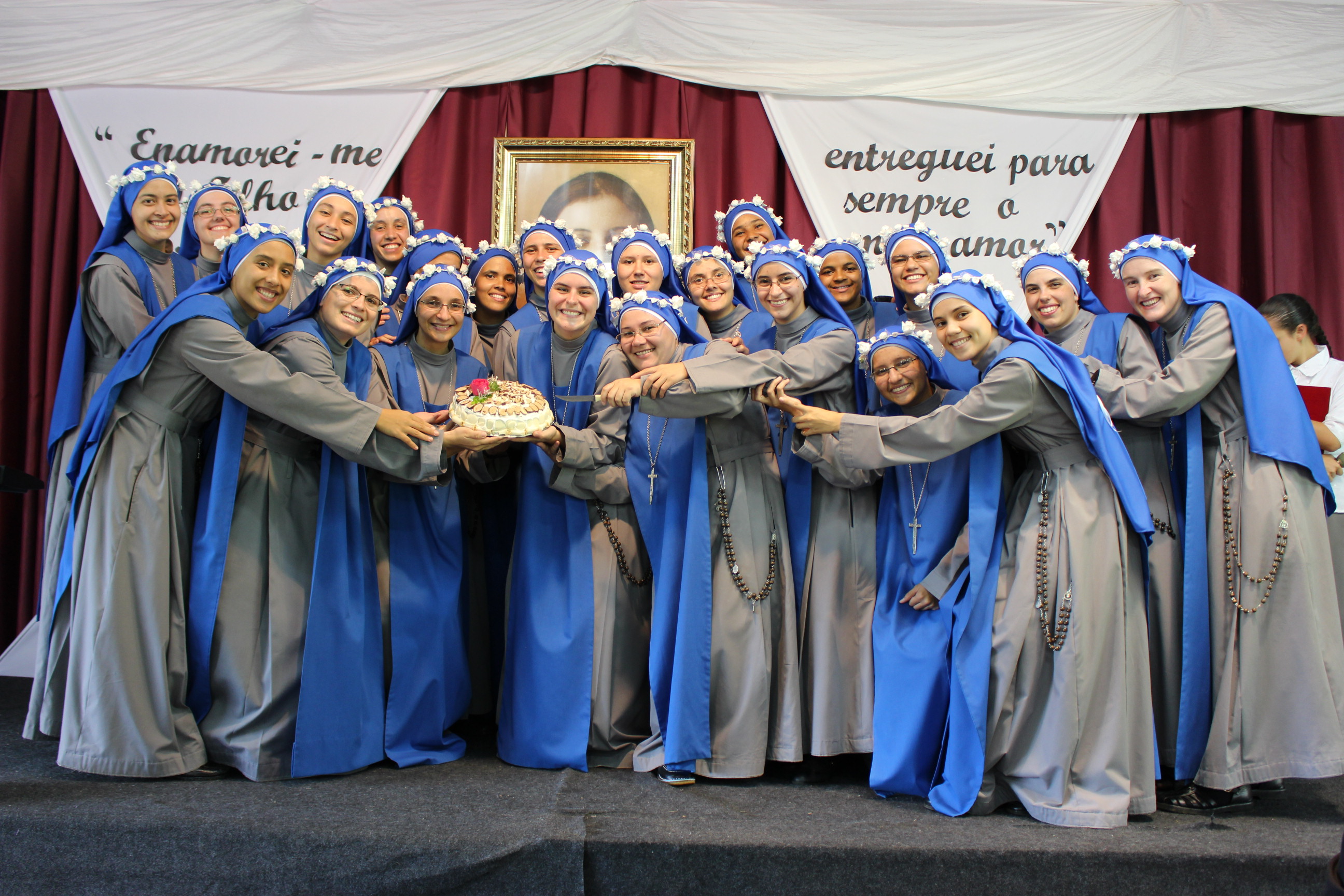 Fue llegando la fecha de la fiesta. Velos azules aquí, coronas allí, hábitos nuevos en confección, la elaboración de la decoración, toda la preparación de la liturgia… Al momento de considerar cómo alojaríamos a los invitados que vendrían para la ocasión, nos dimos cuentas que tal vez habíamos perdido de vista cuántas éramos. Era la primera profesión de los votos de las hermanas del mayor Noviciado que Brasil ha tenido en toda la historia de nuestro Instituto en estas tierras. Sólo las neo profesas eran 23: aunque fuesen pocos los invitados que realmente pudiesen venir (estamos hablando de un miércoles, y la mayoría de las hermanas son de lugares más distantes, incluso tres son de Paraguay), esos pocos multiplicados por más de veinte hermanas, más todas las novicias, postulantes, hermanas de la casa provincial, otras de las casas apostólicas, sacerdotes y amigos… Estos cálculos hicieron caer todo nuestro concepto de “fiesta pequeña”. Tuvimos que ponernos a preparar una gran fiesta, con la Santa Misa en el Convento y el almuerzo en el Salón del Seminario porque realmente no cabríamos en el Estudiantado. En horas como estas, vemos cómo nos salva el espíritu de familia. Y así, gracias al sacrificio de todos, tuvimos una linda fiesta ¡Demos gracias a Dios!
