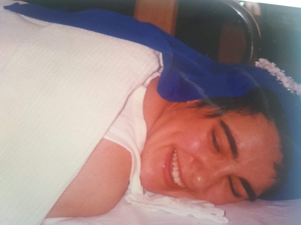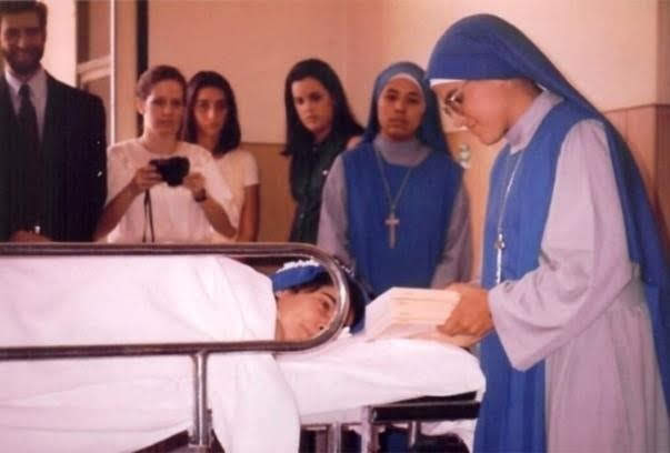 Podríamos decir que aquel accidente fue la preparación inmediata para la primera profesión de los votos religiosos que realizó dos meses después, el 10 de marzo de 1996, en el hospital de Buenos Aires donde se encontraba internada. Las fotos nos la muestran extendida boca abajo sobre una camilla, mirando hacia la derecha, recibiendo el velo azul con la corona de flores blancas sobre su cabeza como signo de los desposorios con Cristo…. y una gran sonrisa.