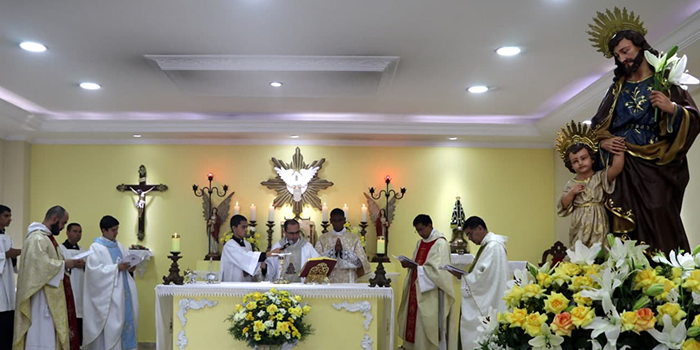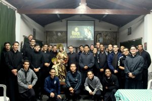 Por todo lo que escribimos arriba es que en nuestro noviciado de Brasil, Santo Antonio de Sant´Anna Galvão, nos preparamos de un modo muy especial durante la semana previa a su fiesta el 1 de mayo. Lo hicimos con unas Jornadas Josefinas tituladas “Ite ad Ioseph”, dichas presentaciones fueron preparadas por los mismos novicios; en ellas se expuso la Exhortación Apostólica Redemptoris Custos de nuestro Padre Espiritual, en el primer día; en el segundo la Carta Apostólica Patris Cordis del Papa Francisco y su Mensaje para la 58° Jornada Mundial de Oración por las vocaciones, San José: el sueño de la vocación; y finalmente sobre las prácticas de devoción al Glorioso Patriarca. En realidad, toda esta preparación fue en orden a disponernos mejor para la entronización de su imagen en nuestra capilla y posterior consagración personal y de nuestra comunidad al “Guardián de las vocaciones”. Su imagen mide un metro y medio, y es oriunda del estado de Minas Gerais, de la histórica ciudad São João del Rei, su belleza es singular ya que representa a San José, joven, viril y robusto guiando de la mano al Niño Dios, imagen perfecta de San José, “Custodio de las vocaciones”[4], como lo llamara su Santidad. Finalmente, el sábado 1 de mayo, tuvimos la gran fiesta de San José, en donde después de bendecir y entronizar su imagen, realizamos una procesión desde el Noviciado, hasta la Iglesia Divino Espíritu Santo, ya que el R.P. Carlos Gonçalves, su párroco también lo entronizó y le consagró su parroquia.