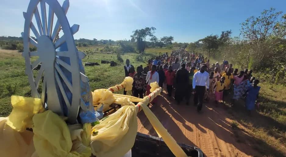 Podríamos decir que aquí comienza la segunda parte de esta crónica, que fue la peregrinación para llevar la imagen a Mazirayo. En esta oprtunidad yo no estuve presente, porque me encuentro en Argentina por los funerales de nuestro Padre Fundador. El acontecimiento tuvo lugar el sábado 20 de mayo. No podíamos realizarlo el mismo día 8 de la Virgen de Luján, por otras actividades importantes. La imagen fue preparada y puesta en un anda que era llevada en camioneta. Al llegar al río, se comenzaría la peregrinación, caminando doce kilómetros. Ya había mucha gente en el lugar esperando, muy temprano. Muchos de ellos habían venido desde sus aldeas, caminando varios kilómetros, incluso algunos desde Mazirayo mismo, es decir que hicieron dos veces el mismo camino.