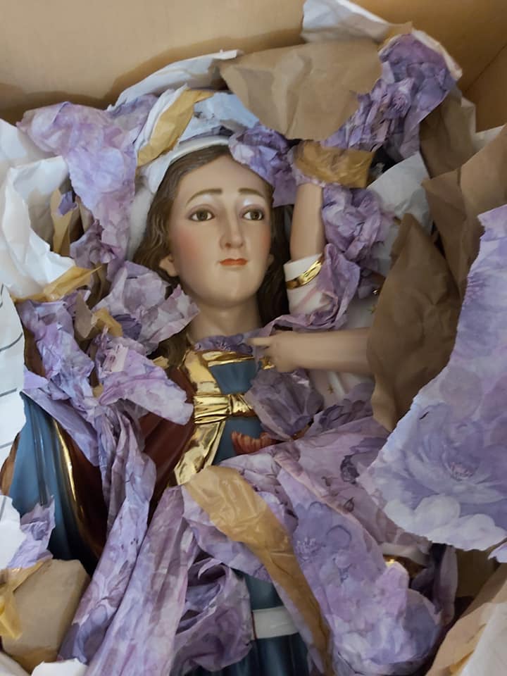 Luego de varias treintenas a San José, y pidiendo la intercesión de la Virgen del Monte, pudimos conseguir el dinero para encargarla. Así que se comenzó el trabajo. Pero había que seguir buscando ayuda, porque debíamos que traer la imagen desde Ecuador hasta Tanzania, casi nada. También se ocupó de esto San José y por medio de nuestras hermanas Servidoras, también pudimos conseguir esta ayuda.