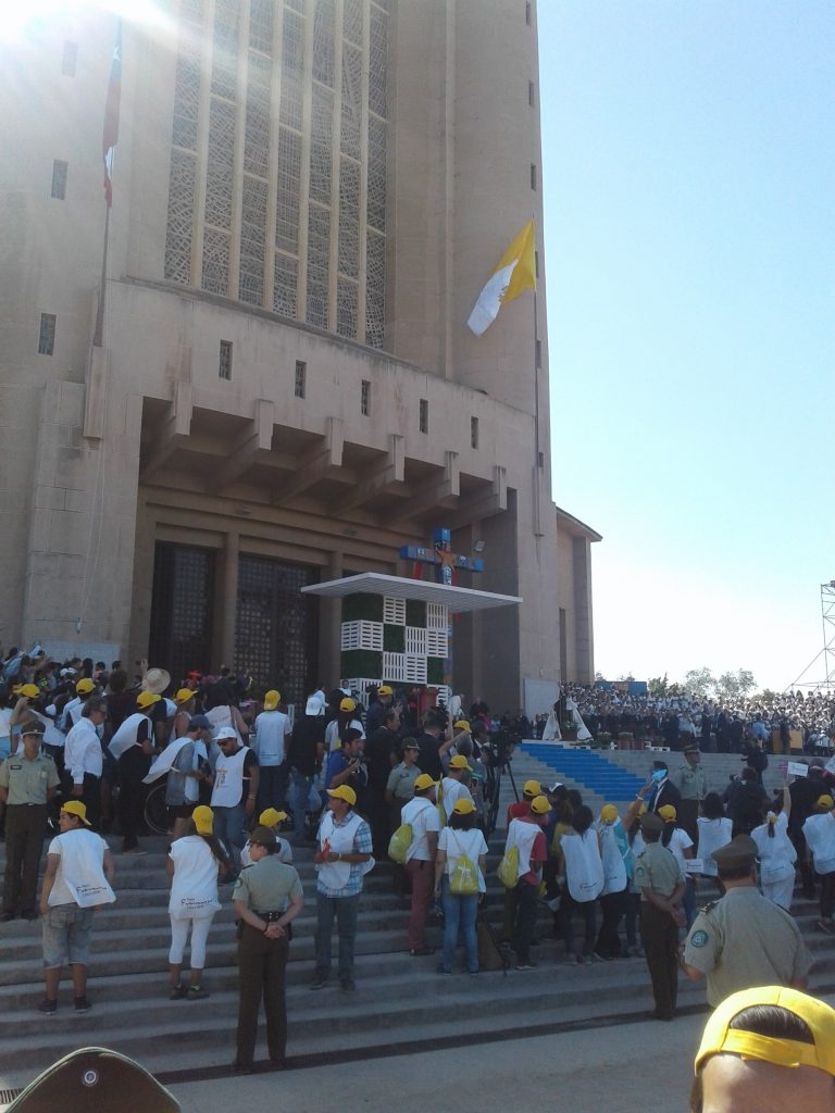 Estuvimos cerca de 6 horas, en la espera dentro del parque O Higgins, nos tocó un lugar frente al altar, ¡sí! Pero bien al fondo, junto al alambrado; desde allí veíamos el metro (subte). Pero al Hno. Brian le consiguieron unas entradas más cerca, así que fuimos allí. Era justo una conjunción de caminos, donde Francisco paso dos veces, los chicos y nosotros felices, vimos al papa a 1 ó 2 mts. aproximadamente