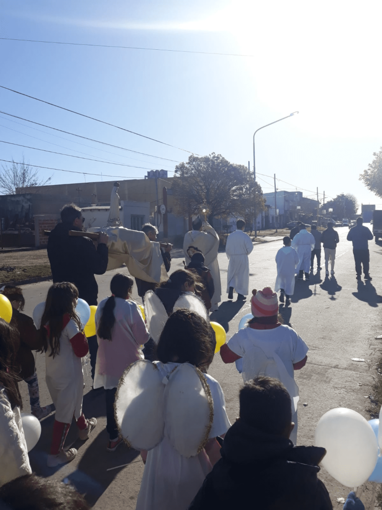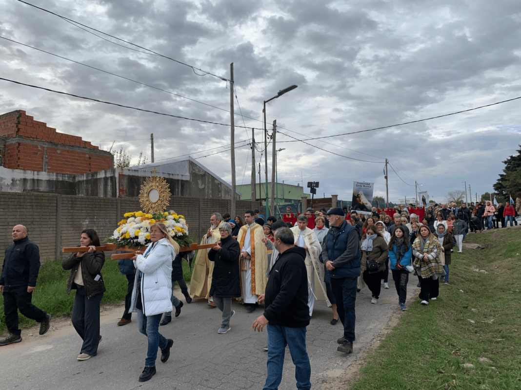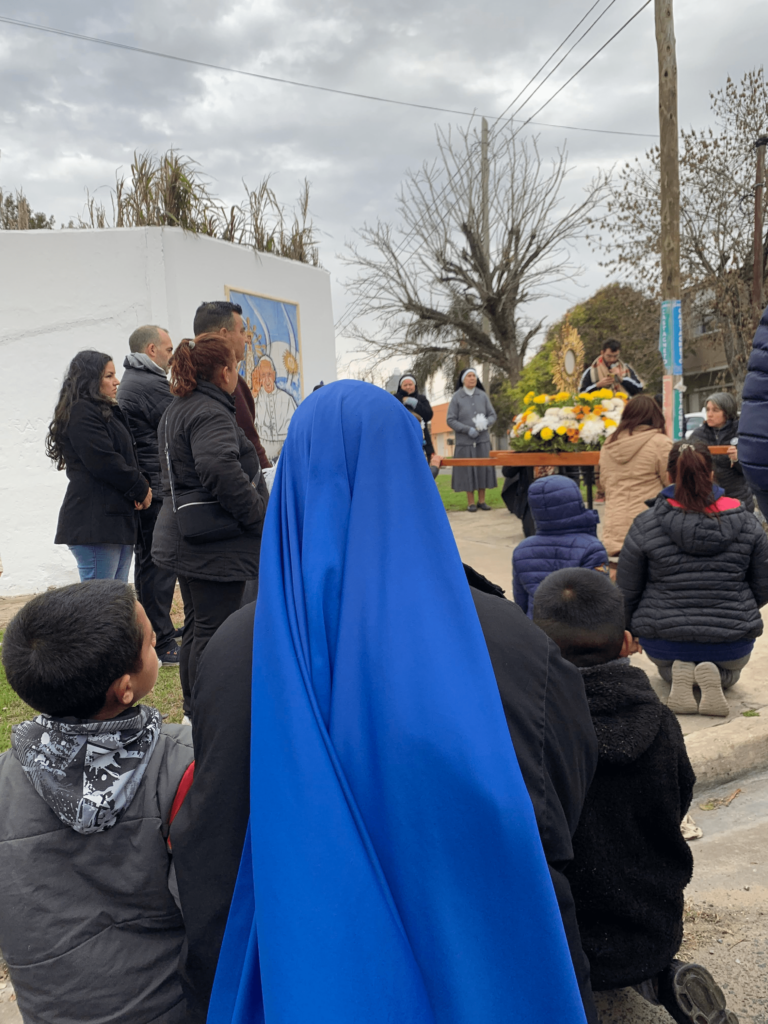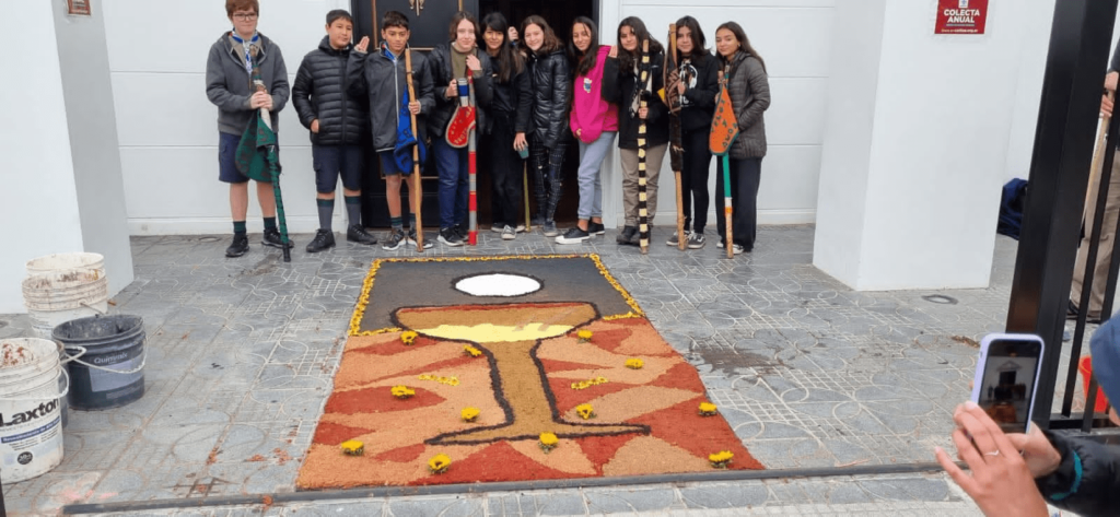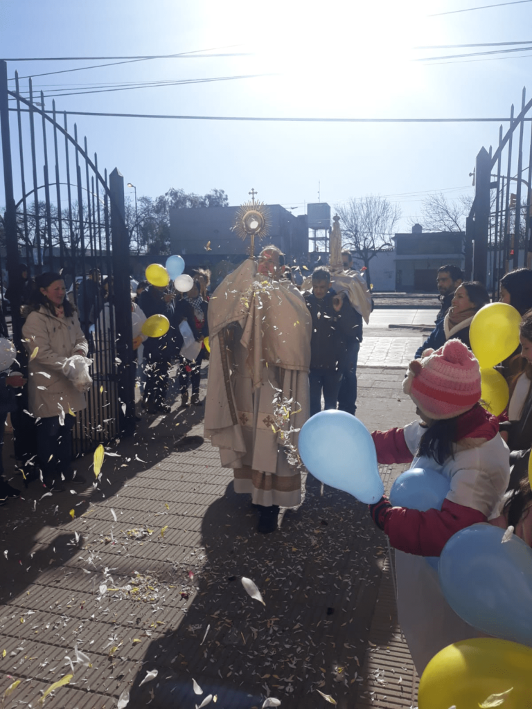 Sábado 10. Se organizó una procesión entre tres parroquias cercanas, pertenecientes al decanato sur de la diócesis, incluida la parroquia Cristo Rey. La procesión comenzó en el santuario de la Medalla Milagrosa y se realizaron tres paradas: frente al colegio de las hermanas “Hijas de Nuestra Señora de Luján”, en la parroquia Ntra. Sra. de Caacupé, y donde está la comunidad de las hermanas de “San José de Cluny”. Después de una hora y media de procesión, llegamos a Cristo Rey donde los Scout esperaban con la guardia de honor la llegada del Santísimo Sacramento. En el atrio del templo un grupo de Scout con una hermana armaron la alfombra con un motivo eucarístico.