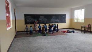 Pero ahora les cuento de otro gran paso en este esfuerzo de “hacer” una parroquia, y es que ya tenemos “Escuela parroquial”. Cuando estuvo visitándonos allí Mons Minde, nuestro obispo, el año pasado para el tiempo de pascua, le conté del proyecto y le pareció muy bien, nos alentó, y hasta nos sugirió el lugar para edificar las primeras aulas. Esto se comenzó a concretar gracias a un muy generoso donante que me dijo que quería colaborar con algo relacionado con la educación, y si fuera una escuela, mucho mejor. Dios nos estaba diciendo que comencemos, pues teníamos todo al alcance de la mano. De esta forma el día de la fiesta patronal de San Martín de Porres, 3 de noviembre, pero que lo celebramos el 7 de noviembre, día domingo, hicimos la bendición de los cimientos. Parece increíble que tan solo tres meses después ya tuviéramos el edificio levantado, completo, y muy hermoso… dos grandes aulas para albergar a 40 alumnos de jardín de infantes en cada una. Ahora estamos haciendo los pupitres para las aulas, pero por el momento los niños tienen clases sentados en esteras en el piso.