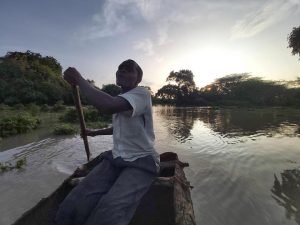 Bueno, pero el viaje no fue tan sencillo, pues gracias a tantas lluvias (que hemos pedido y estábamos esperando), el río estaba lleno de agua. En la época de sequía cruzamos con los vehículos por el cauce totalmente seco, pero ahora se debe cruzar con las balsas que hacen con corteza de árboles. En algunas partes debimos caminar por campos de arroz inundados, luego subimos la moto a una de las balsas, y del otro lado seguimos viaje hasta Itumbo.