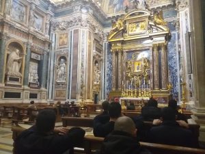 A conclusione della visita della Basilica Vaticana, è stata raggiunta la Chiesa del Santo Spirito in Sassia, nella quale era in atto l’Adorazione al Santissimo Sacramento e la preghiera dei Vespri con tutta la comunità. Dopo la Benedizione Eucaristica, ha avuto luogo la celebrazione della Santa Messa. La chiesa, ospitante una particolare devozione alla Divina Misericordia ha permesso di rivolgere intercessioni a Santa Faustina Kowalska, della quale ogni membro del noviziato ha ricevuto una reliquia.