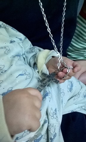 Cierto día soleado, llevaba en mis brazos a Rosario[1], una pequeña niña de un año y medio, para que aprovechara a jugar en el parque del hospital junto con los otros niños. En el camino, ella toma, como ya se había hecho costumbre, la cadena para buscar la cruz y observarla entre sus manitos. Yo le pregunto, sin esperar respuesta, pues aún no había aprendido a hablar, “¿quién es?”. Grande fue mi sorpresa escuchar susurrar de sus labios un tímido “Eee-sús”.