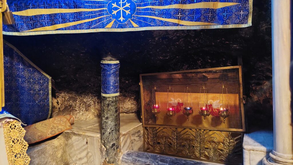 Santa Brígida, al visitar este lugar santo en Belén, tuvo una visión en la cual, después del parto milagroso, cuenta que la Virgen tomó al Niño, lo envolvió en pañales y lo recostó en el pesebre. A la Madre Virgen se le unió luego San José, que al escuchar el llanto del Niño se acercó a esta parte de la gruta, y arrodillado junto a María, adoraron entre lágrimas de gozo al Dios recién nacido, no recostado sobre púrpura y seda, sino sobre paja, para darle un poco de calor en aquella fría noche.