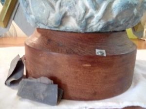 En la coronilla de la cabeza faltaba bastante pintura y tenía un orificio muy agrandado que era donde se introducía la corona. Para restaurarla usé dos mezclas de azul, con toques de negro para lograr el color lo más parecido al original. Pinté solo en las partes saltadas. Restauré el orificio de la cabeza dejándolo preparado para volver a colocar un soporte para la corona. |