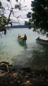 Los tres jóvenes, cuyos nombres son Paras, Umea y Baren, me llevaron a su bote. Cargamos las cosas y nos embarcamos. ¡Qué emoción! Subirse al bote y comenzar a navegar por esos mares del eterno Pacífico. Yo estaba felicísimo y lo preguntaba todo. “Esa isla… ¿cómo se llama?, ¿y esto?, ¿y aquello?”. Los tres jóvenes, más el capitán de nuestra pequeña lancha y los otros tres pasajeros-una señora con un bebe y una niña, Ana- me miraban como si fuese un extraterrestre. No por mi aspecto -aunque podría haber sido también- sino por las miles de preguntas que les hice en nuestro corto trayecto de media hora. Habrán pensado que caí de la luna y que por primera vez veía el mar, o algo así. Ellos balbuceaban un inglés inentendible. Luego me dijeron que no es inglés, sino el famoso pidgin, el idioma común que se habla tanto en Salomón como en Papúa. Broken English, lo llaman ellos. Yo lo llamaría apenas English. De todos modos, esto me hizo pensar luego, que, en mi primer viaje en lancha, allá en Oceanía, tuve como compañeros de tripulación a varios políglotas, porque hablan pidgin y gilbertés.