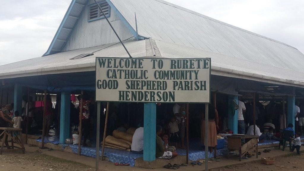 Aclaremos un poco que nos estamos mareando: las Islas Salomón y Kiribati son países diferentes. Kiribati está situado en el medio del Pacífico y tiene la peculiaridad de ser el único país que se encuentra en los cuatro hemisferios. Un grupo de sus habitantes fue trasladado a las Islas Salomón, a la isla de Waguina. Allí tenemos la parroquia y con ellos trabajamos. Trabajamos con inmigrantes… Por eso el que llega a nuestra parroquia, llega de algún modo a un país dentro de otro. Ahora bien, algunos de estos kiribatianos se mudaron a Rurete, en Honiara mismo.