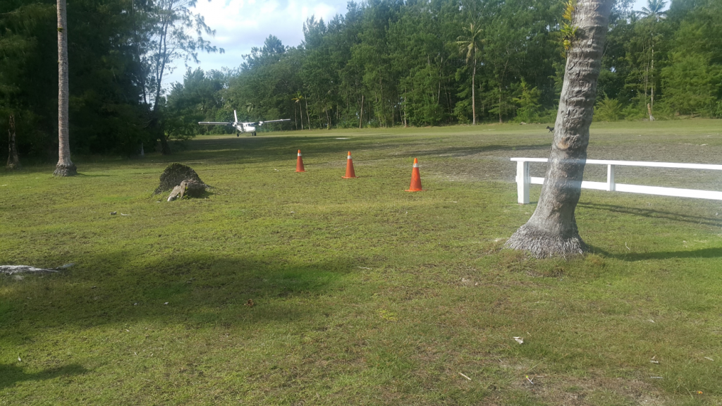 Mientras pensaba estas cosas, empezamos a descender. ¡Cómo se balanceaba el avioncito! De todos modos, yo casi que no le prestaba atención. Miraba el mar y sus colores innumerables. Miraba los arrecifes a los cuales nos acercábamos más y más, de tal modo que parecía que nos toparíamos con ellos, pero no fue así, porque aterrizamos perfectamente en la hermosísima isla de Kagau, el aeropuerto más lindo que vi en mi vida, aunque ciertamente el más pequeño.