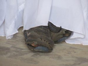 Si pudieran ver las fotos en detalle, verán el estado de los pantalones de los varones, con muchos descosidos y remiendos, algunos pantalones sostenidos con una cuerda, las zapatillas o zapatos rotos, con los dedos que asoman, y algunos con calzados prestados, evidentemente, por lo que se puede ver en la desproporción del tamaño. Pudimos ver muchas niñas que llevaban su vestido arreglado o con remiendos y costuras caseras, y algunas de ellas llevaban calzados muy pobres, que prefieren dejar en el banco y pasar a comulgar descalzas. Nos llena de admiración, y nos enternece también, porque nos muestra a las claras que se trata de niños pobres, de aldeas muy lejanas. Pero hay otra cosa… de verdad que “brillan” en su primera comunión, por sus rostros alegres, y sus miradas puras.